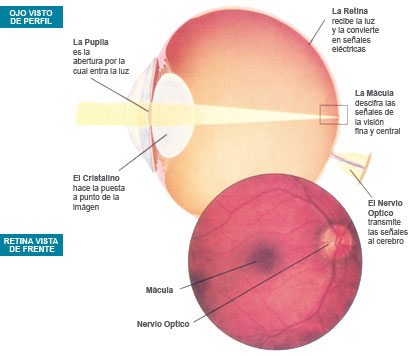La imagen recibida por el ojo es puesta a punto y analizada por el centro de la Retina, sobre la Mácula. El resto de la retina permite el análisis del campo visual periférico.